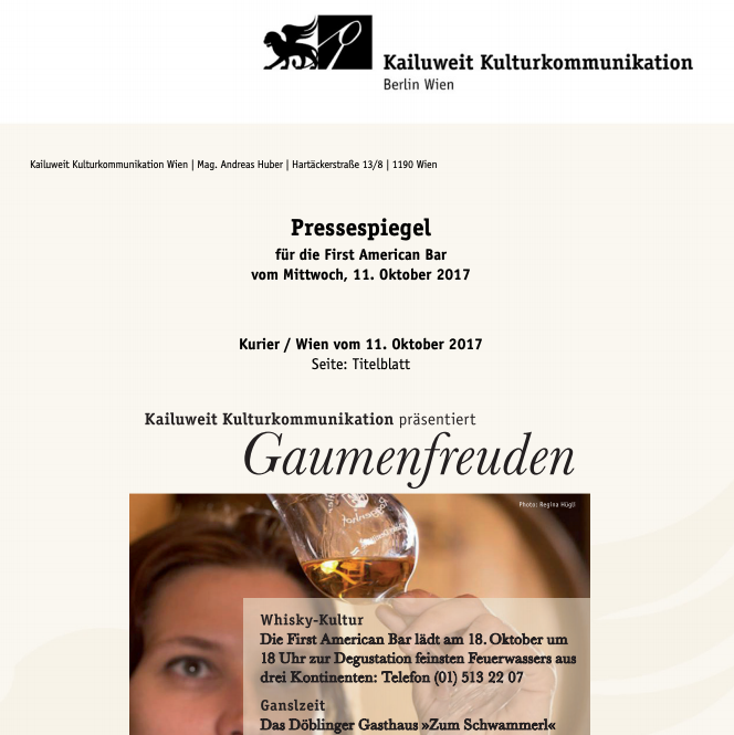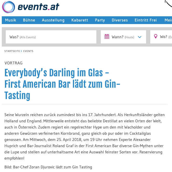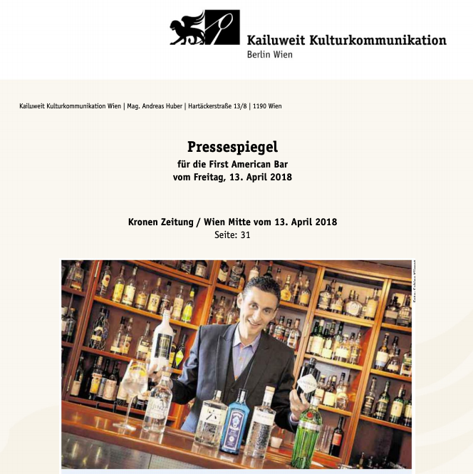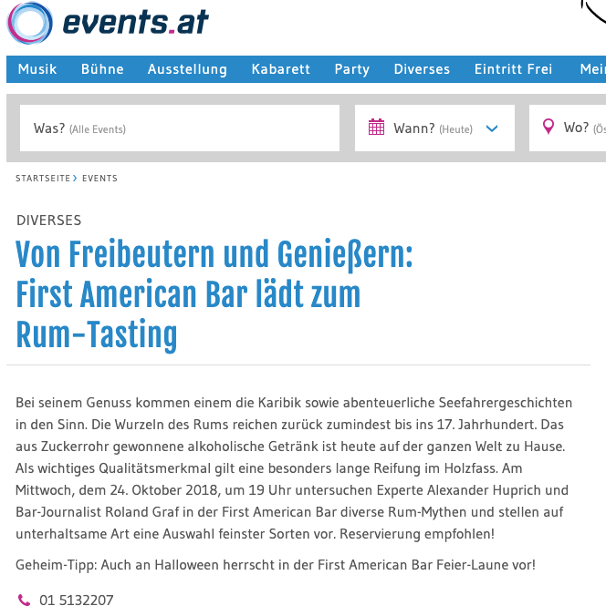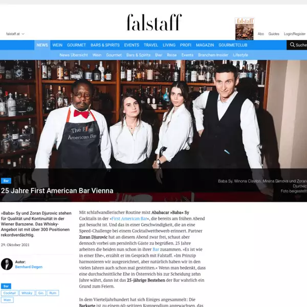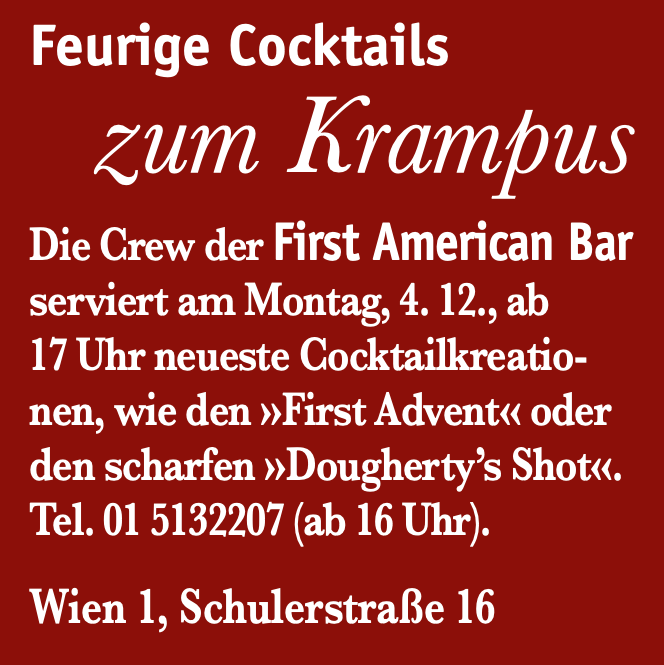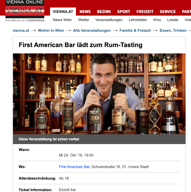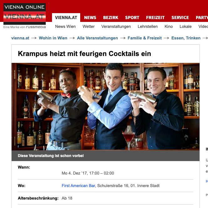 Cocktailbar First American Bar rating by Falstaff Expedia 25 years of First American Bar Vienna 25 years of First American Bar Vienna The “First American Bar” is a classic in the city First American Bar invites you to a rum tasting October 24, 2018. Events.at – First American Bar invites you to a rum tasting Everybody’s Darling in a Glass – Events.at 25.04.2018. Press review April 13, 2018. Press review October 18, 2017. Press review October 11, 2017. Fiery cocktails for Krampus 04.12.2017. Krampus heats up with fiery cocktails 04.12.2017.